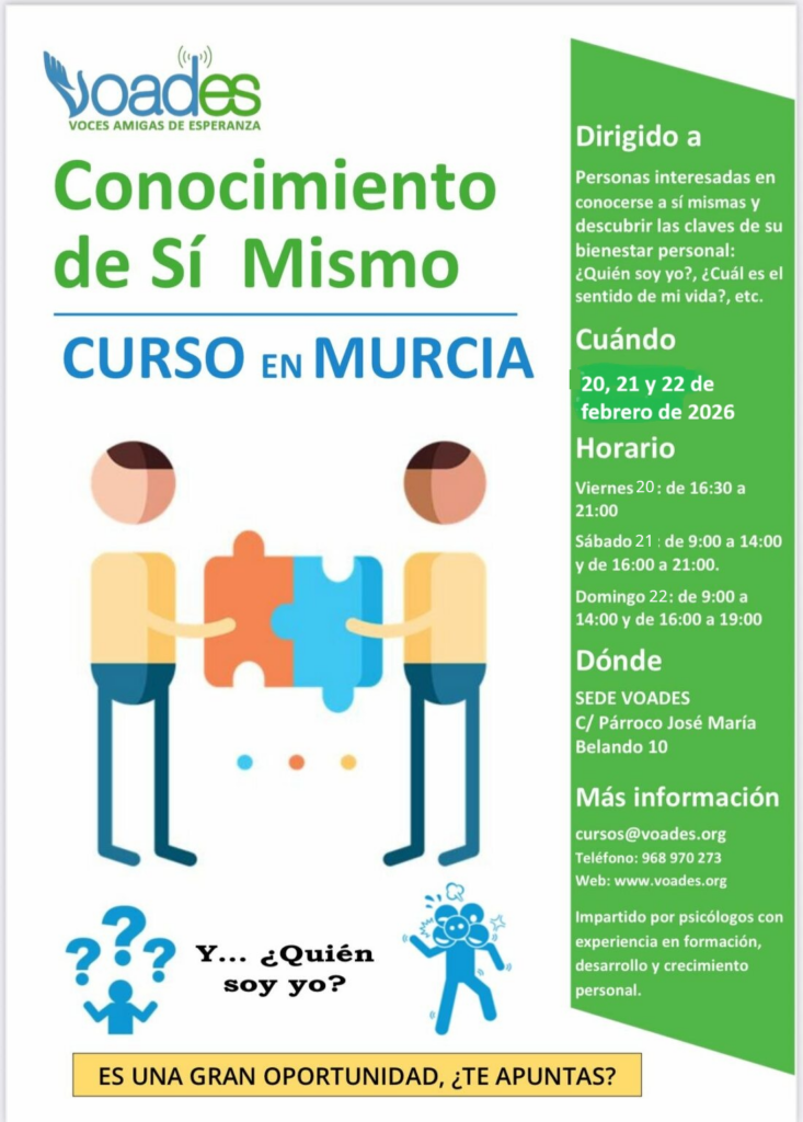 Tardes de Salud Emocional. Fecha: todos los primeros lunes de cada mes, a las 18:00 horas. En la sede de VOADES de Murcia. También se pueden seguir online.