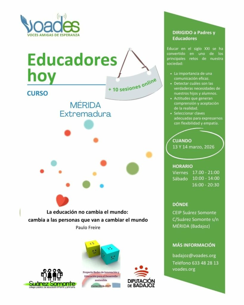 Curso: Educadores Hoy. Viernes y sábado, días 13 al 14 de marzo de 2026. Horario: de viernes a las 17:00 a sábado a las 20:30. En Merida (Badajoz).