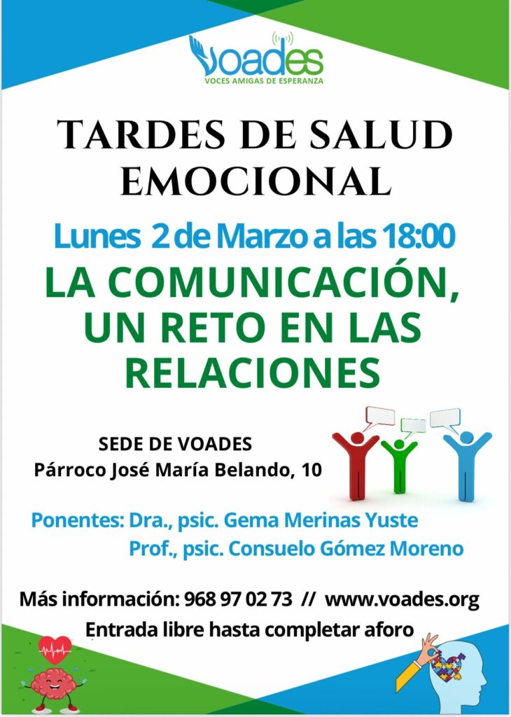 Tardes de Salud Emocional. Fecha: lunes, 2 de marzo 2026, a las 18:00 horas. En la sede de VOADES de Murcia. También se pueden seguir online.